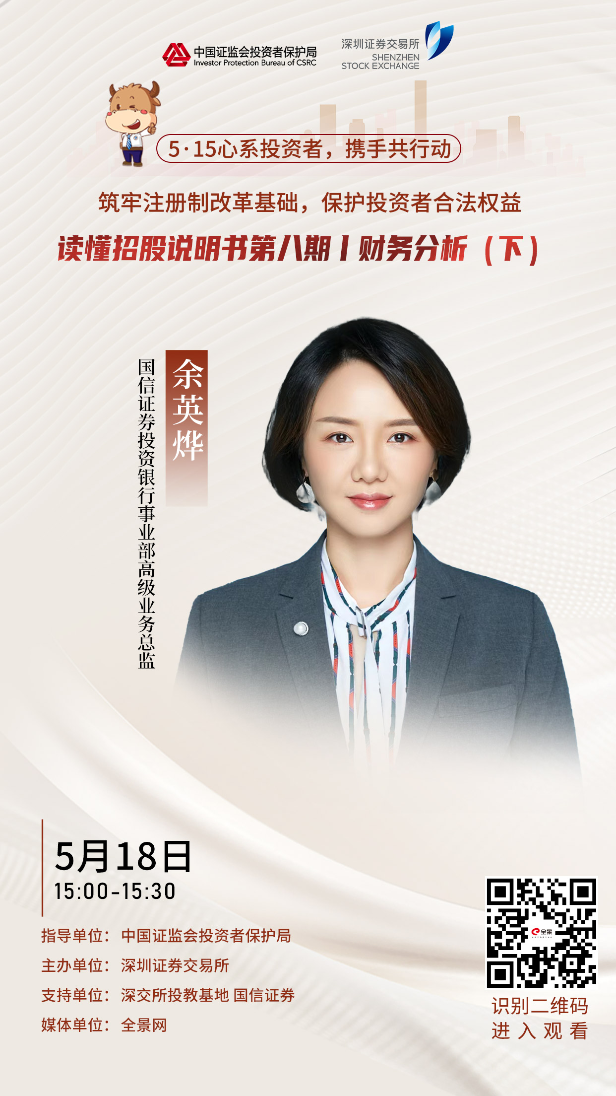 为贯彻落实证监会“5·15全国投资者保护宣传日”活动要求,深交所持续推出《读懂招股说明书》系列节目。第八期活动(5月18日周三下午3点)邀请到国信证券投资银行事业部高级业务总监余英烨为投资者讲解阅读招股说明书时的财务分析技巧,帮助投资者了解发行人的财务经营状况,帮助投资者掌握阅读招股说明书的技巧,旨在筑牢注册制改革基础、保护投资者合法权益,欢迎感兴趣的投资者关注收看!