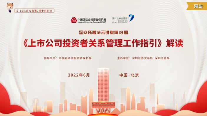 6月30日(周四)下午15:00-15:30,深交所推出第18期普法云讲堂活动。活动特别邀请到中国证监会投资者保护局有关专家对《上市公司投资者关系管理工作指引》进行解读,帮助投资者了解认识指引内涵和修订意义,促进投资者与上市公司良性沟通,欢迎感兴趣的投资者关注收看!