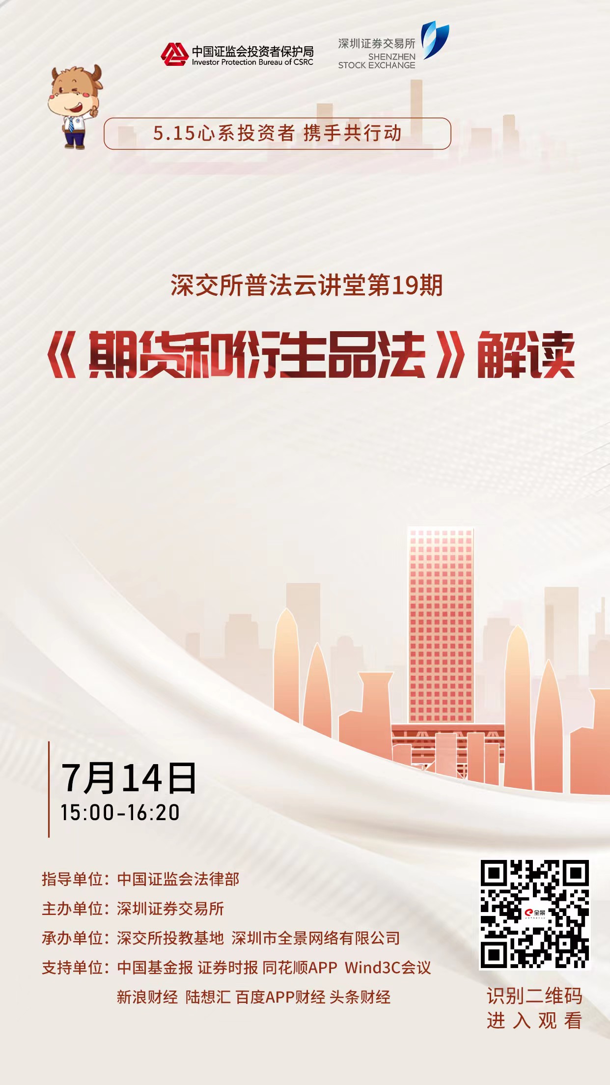 7月14日(周四)15:00—16:20,深交所普法云讲堂活动特别邀请到中国证监会法律部有关专家讲解《期货和衍生品法》主要制度安排,重点解读期货经营机构和期货交易者保护相关规定,欢迎感兴趣的投资者关注收看!