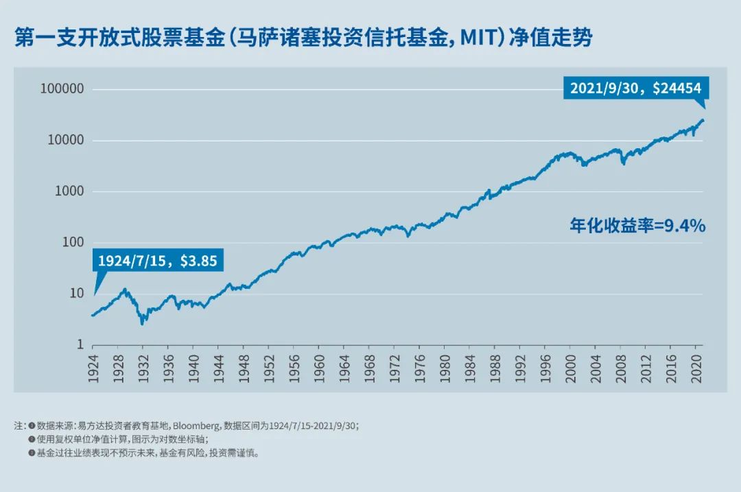 1924年在美国成立的“马萨诸塞投资信托基金”(MIT),是公募基金史上第一只开放式共同基金(Mutual Funds),成立日它的初始净值为3.85美元(美国基金初始净值并不一定为1),到了2021年9月30日,其复权单位净值已经增至24454美元,上涨了6351倍,年化收益率达到9.4%。